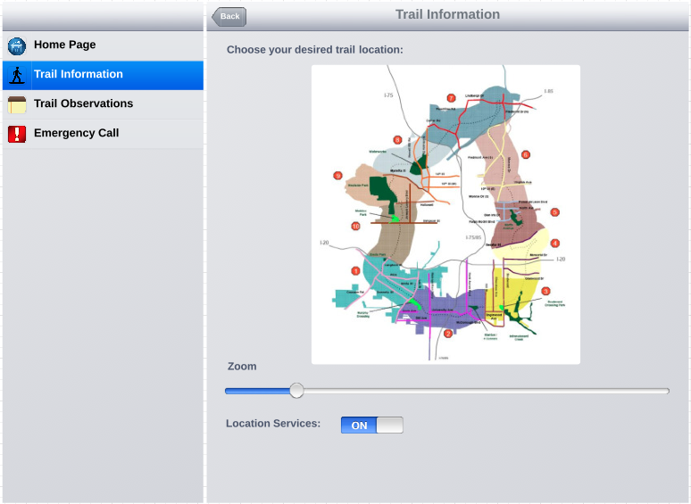 I also contributed to the design of the physical kiosk (color scheme, presence and location of light strips to indicate trail safety status, and button design and placement within the app). I designed the administrator website used to update the information provided by the kiosk as well.